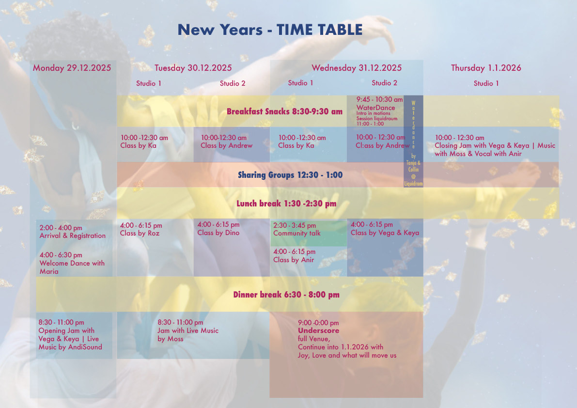 For the Waterdance sessions, a separate sign-in is required during registration (max. 20 participants). Please book and pay your session directly via Liquidrom in advance, and send us the receipt so we can confirm your spot.
